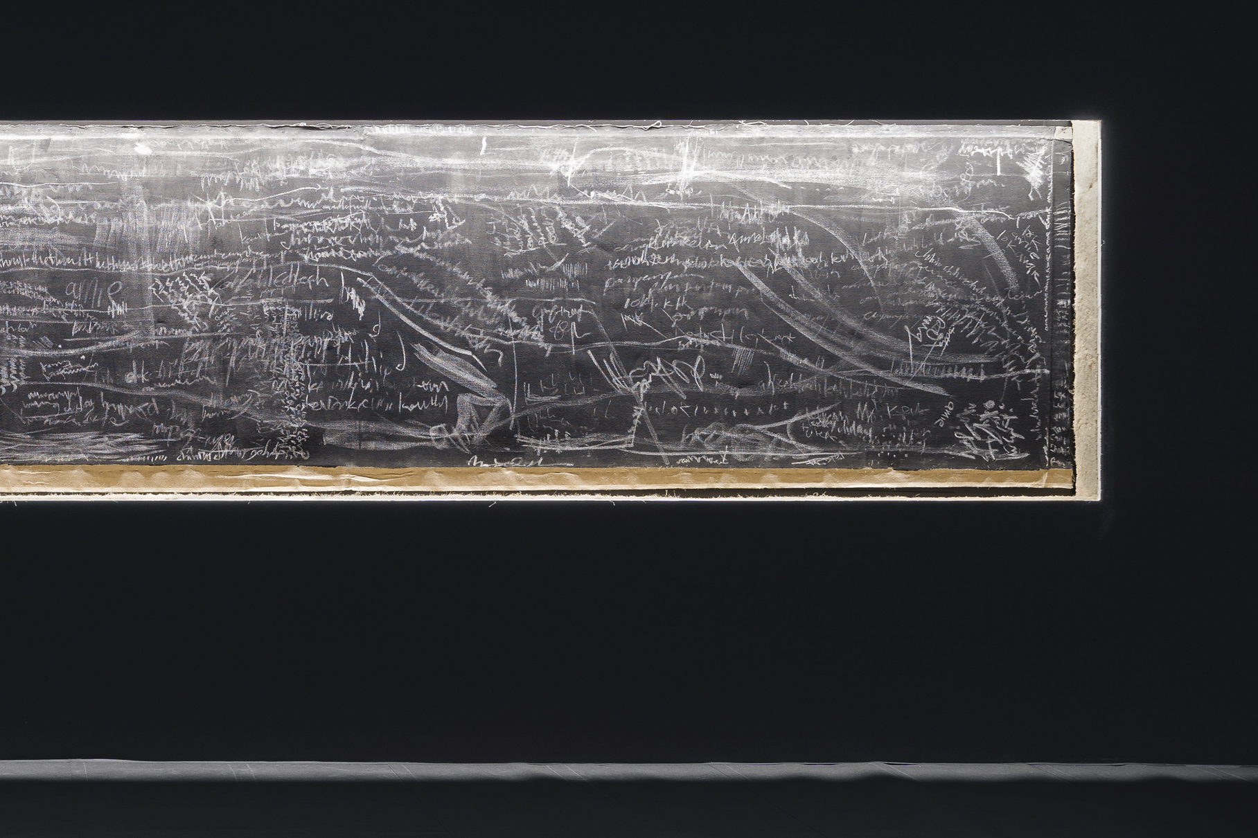 At the heart of this scenery stretches a landscape of paintings by Pan Daijing (b. 1991). Her Cream Cut 1 and Cream Cut 2 (2024–25) – vast black-and-white expanses made with chalk and pigment – are not images but remnants, inscriptions left by her performances, by bodies in trance-like liminal stages carrying out indecipherable automatic writing, deconstructing language. Staged within a specially built wall structure, they form a topography of traces of states the performers pushed themselves into – states of melancholy, collapse, delirium, and disquieting internal struggle. These are accompanied by Daijing’s sound work Untitled (2022) – a haunting sonic landscape comprising a score of voices, lamentations, and glissandi. Language disintegrates into texture, words unravel into noise, until the air itself becomes thick, tactile, charged with anguish and electricity. Her work is a theatre where performers surrender control, letting anything happen.