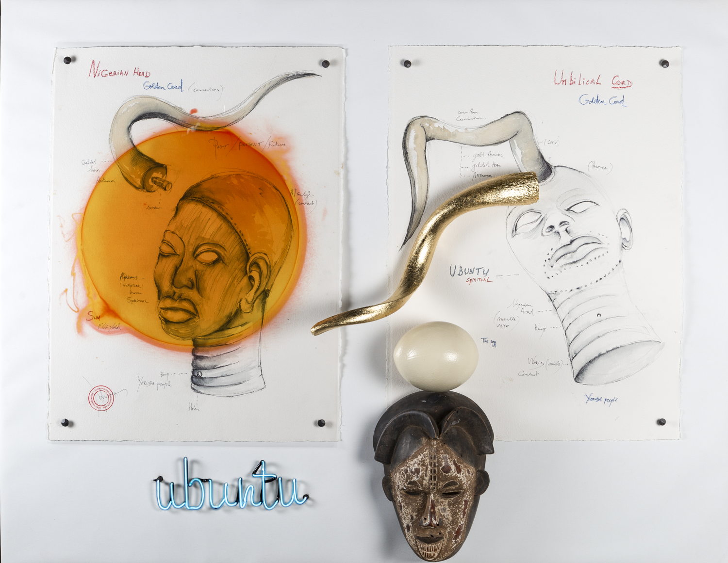 Koen Vanmechelen, Ubuntu, Lambda print op plexiglas, parelhoen, glazen masker, zwart lederen lijst, 260 x 165 x 24 cm © Koen Vanmechelen, 2019, photo by Stoffel Hias