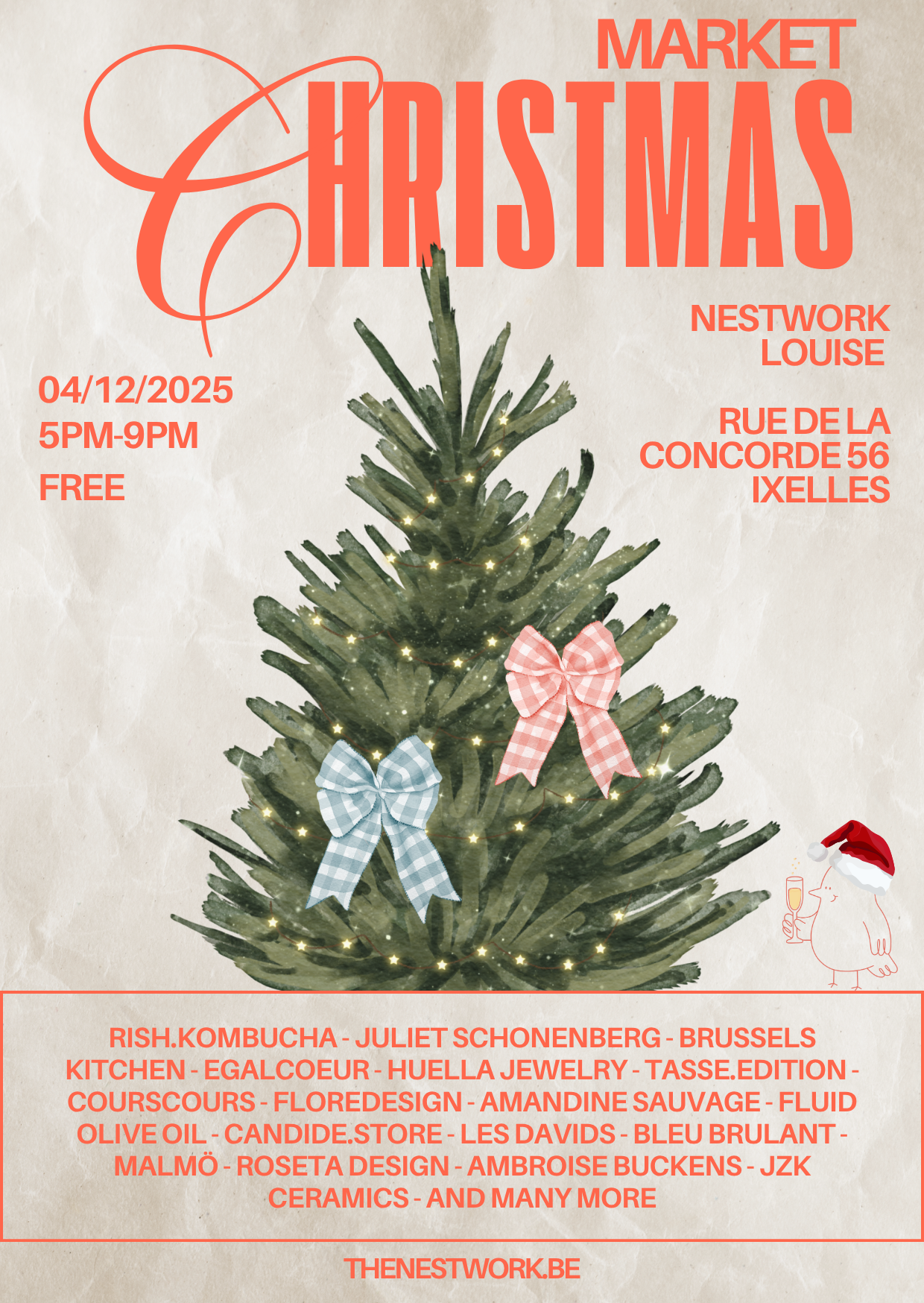 Le 4 décembre, The Nestwork Louise organise son tout premier marché de Noël, à l’heure de l’afterwork, de 17h à 21h, dans sa maison de maître bruxelloise. Une vingtaine de créateurs et marques belges — Brussels Kitchen, Juliet Schönenberg, Huella Jewelry, Rish Kombucha, Égalcoeur… — y présenteront leurs collections le temps d’une soirée conviviale et festive.