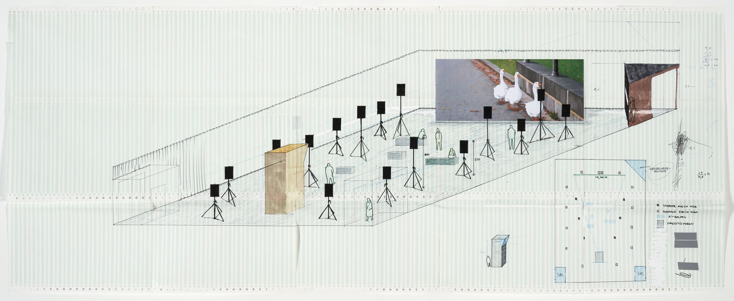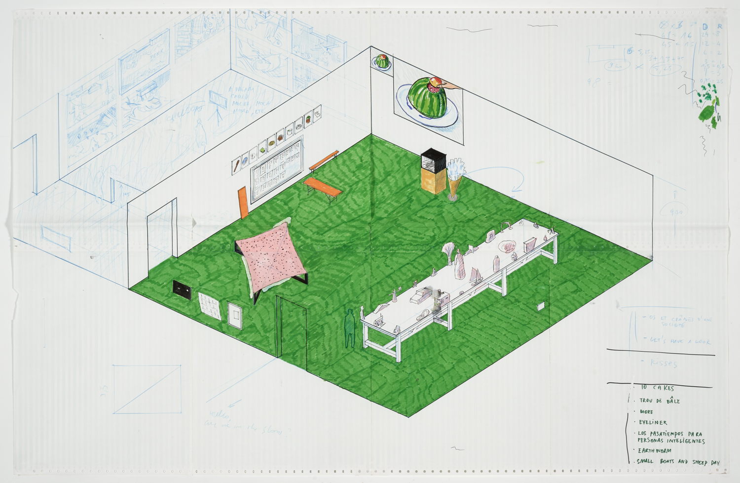 Par le biais de cette exposition solo, le S.M.A.K. accueille la première présentation muséale du film d'animation ‘HELLO, ARE WE IN THE SHOW ?’. En guise de suite contemporaine de la série de tapisseries du 16ème siècle intitulée ‘Les Chasses de Maximilien’, le film nous emmène à la découverte de quelques paysages de la forêt de Soignes. À cet égard, la nature n'est pas idéalisée, mais placée dans une perspective critique qui montre l'interaction et l'interdépendance entre l’ensemble des formes de vie. Cette œuvre récente, le fruit d’une coproduction avec le S.M.A.K., a été retravaillée dans le cadre de cette exposition, et forme ainsi une installation impressionnante qui occupe toute la salle du milieu située à l'étage du musée. Depuis 2016, le scénarimage du film appartient à la collection du S.M.A.K.