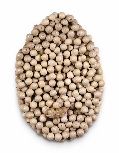 Ovale avec oeufs peints numérotés et petite assiette, 1966. Verf, eierschalen en schaaltje op paneel. 81 × 54 × 15 cm. Privécollectie. Foto © Estate Marcel Broodthaers