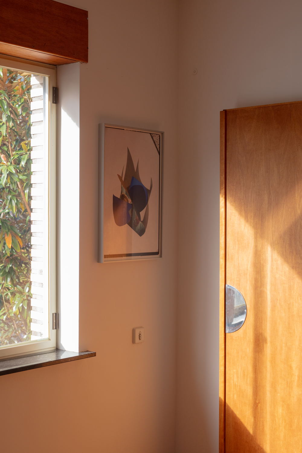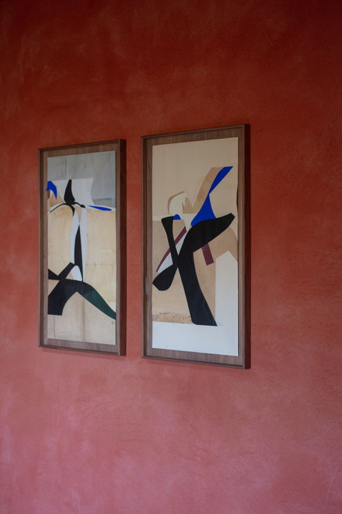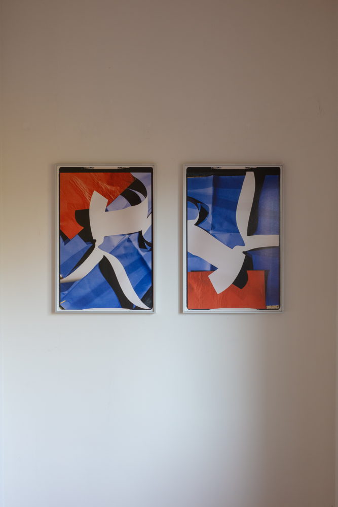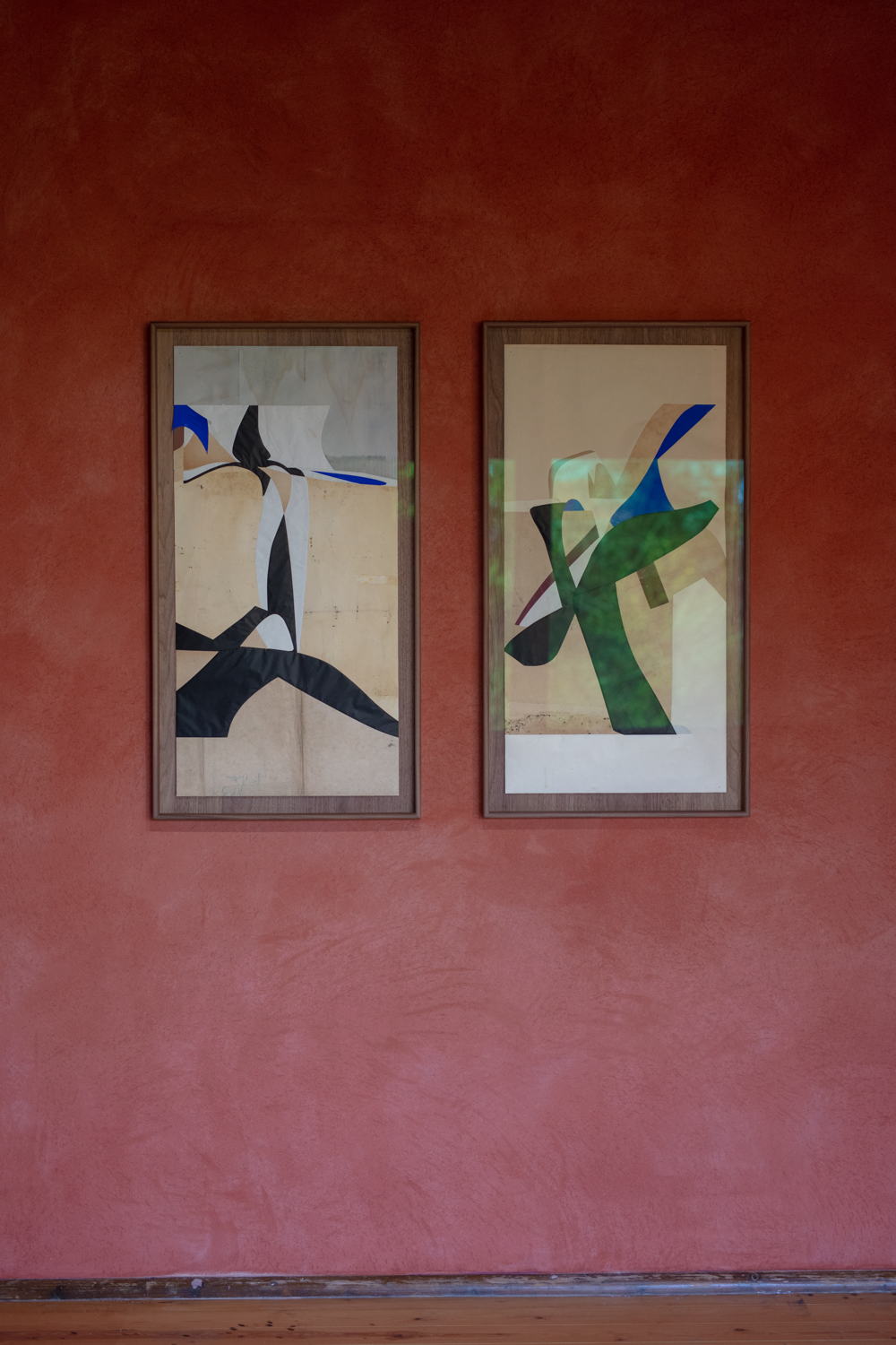 Allitererend bestaat de neiging om naast die albatros het woord abstract te gebruiken, maar laat niemand dat doen. Over elke lijn is nagedacht omdat juist weerhaken interessant zijn. Zijn collages leven van weerhaken. Zijn foto’s leven van zijn collages. Alles heeft alles nodig. Hoe het licht valt op plooien, formaten, voorwerpen, flora, hoeken, zonder zoeken, enkel door aandacht, door twijfelen, door stilstaan, achterover leunen, herbekijken, door binnen te halen, op te slaan, te herdenken, zo ontstaan zijn nieuwe vormen. Uitgesneden kaders, ingepakt in lagen van oud papier, gevonden op het Vossenplein, al betekend door architecten of ontworpen door behangpapierontwerpers. Dan volgt de titel. Gioa I. Gioa II.