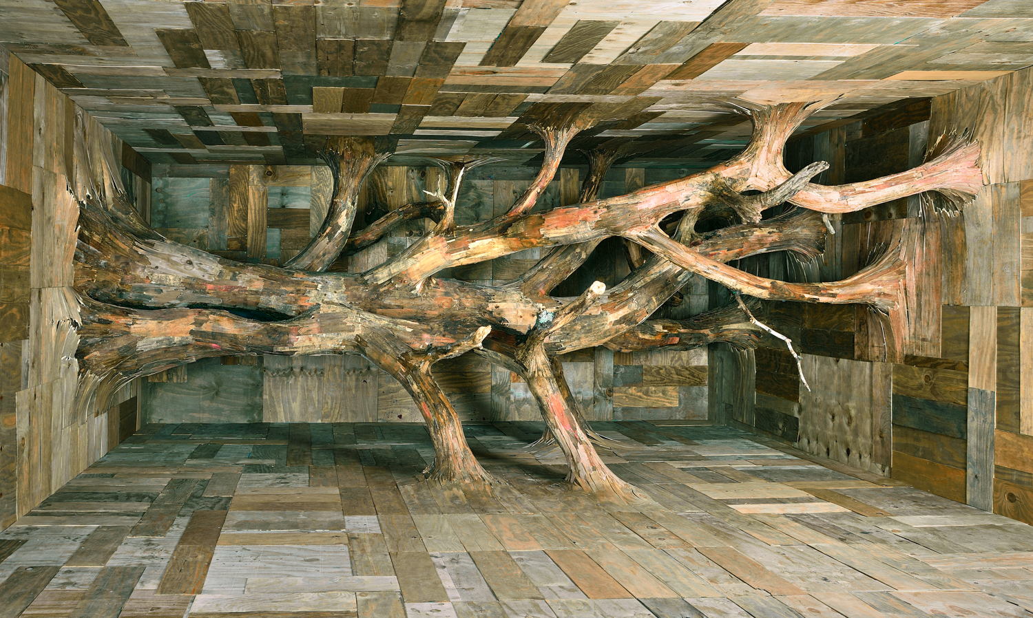- Henrique Oliveira (BR) puzzelt op de restanten van het laatste overblijfsel van de stenen omwalling aan de Pottenmakersrei met gevonden multiplex organische vormen in elkaar die lijken op grote takken, wortels of boomstammen. De installatie is zo waarheidsgetrouw dat de samengestelde takken afkomstig lijken van bomen die zich achter de ommuurde tuin begeven. Het laat de bezoeker nadenken over hoe hedendaagse kunst zich laat zien in een historische stad.