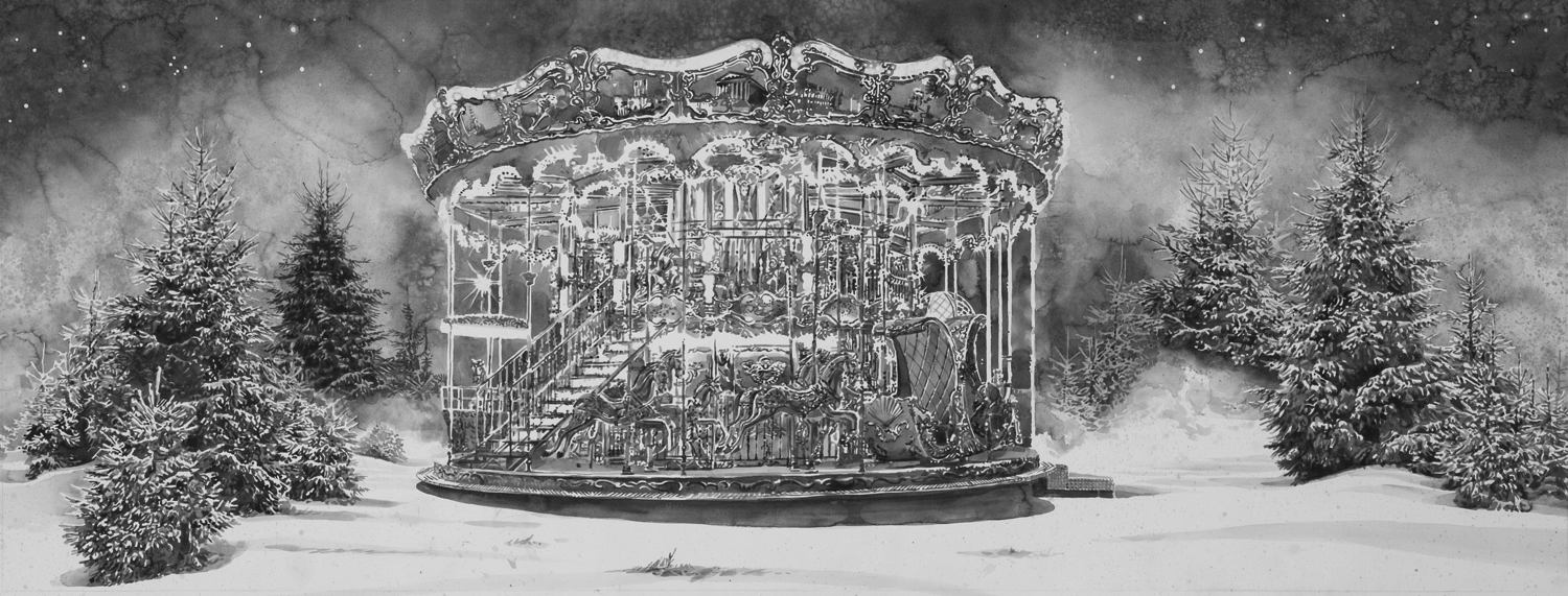 - Hans Op de Beeck (BE) toont een draaimolen op ware grootte (1:1) die statisch, stil en monumentaal in de Brugse omgeving plaatsneemt. De installatie is monochroom gekleurd in grijze tinten, heeft een diameter van 12 meter en is ongeveer 4 meter hoog, waarbij de geënsceneerde reeks sculpturen van paarden en koetsen versteend lijken.*