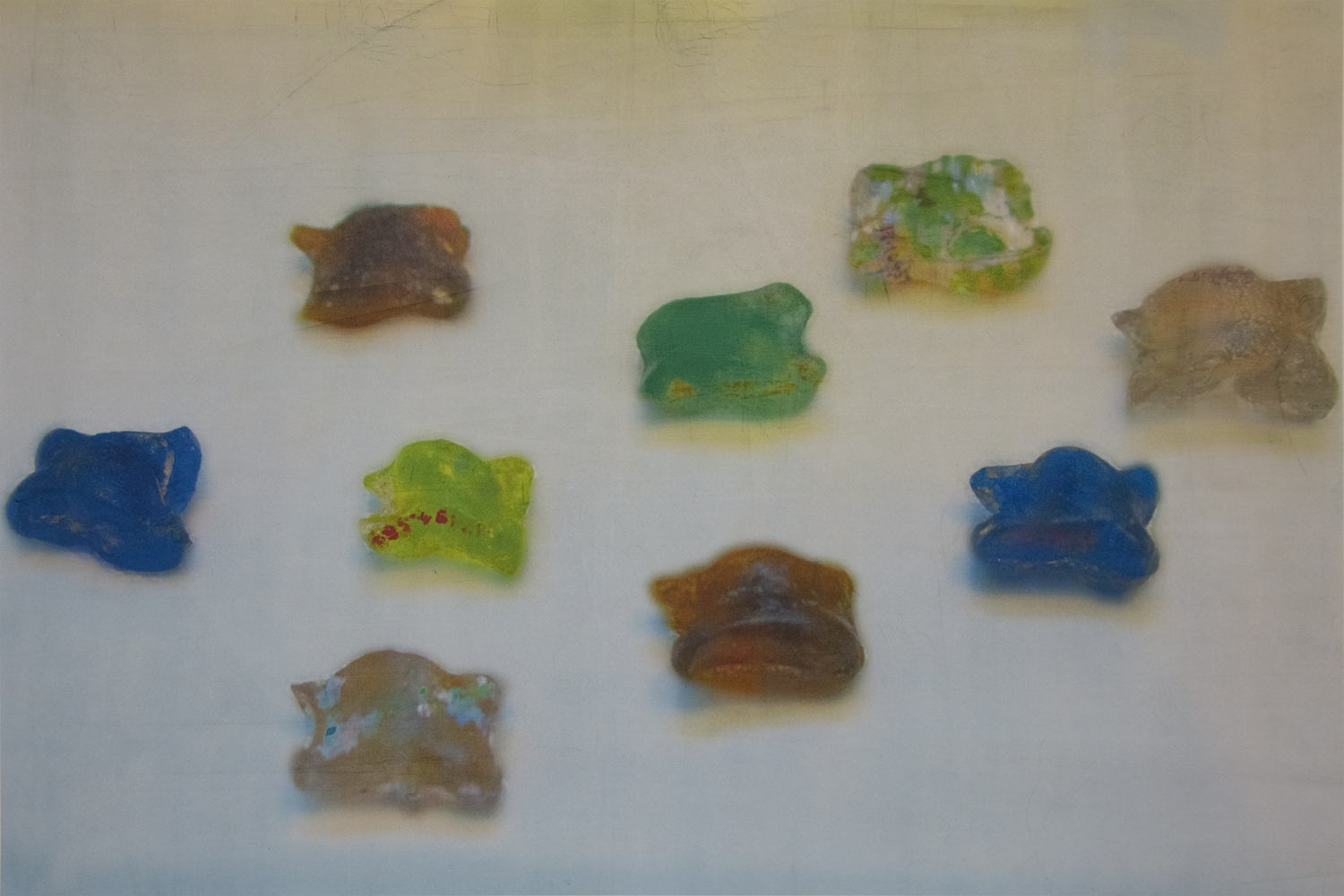 Ces multiples tirages réalisés à partir d’un seul et même négatif deJulia Mamaea, image séminale et matricielle, déboucheront ensuite sur plusieurs visites de sites et de musées, notamment à Athènes et Éleusis, ainsi que sur l’étude des théories des couleurs dans l’Antiquité, en particulier celle d’Aristote. L’observation des objets colorés que celui-ci effectue dans la nature, chez les plantes notamment, trouve un écho étrange et lointain dans le processus photographique de James Welling, à travers sa description des phénomènes de fixation, de rinçage ou de virage des teintes, par exemple du vert des feuilles.